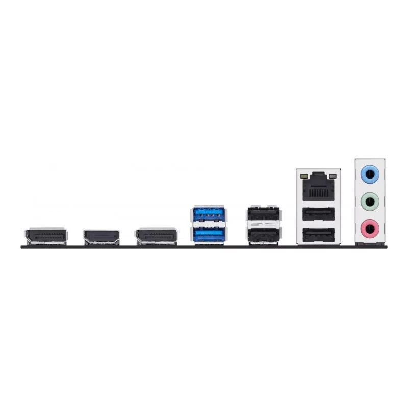Panel trasero: 2× USB 5 Gbps, 4× USB 2.0, 2× DP, 1× HDMI, LAN 1 Gb, 3 audio