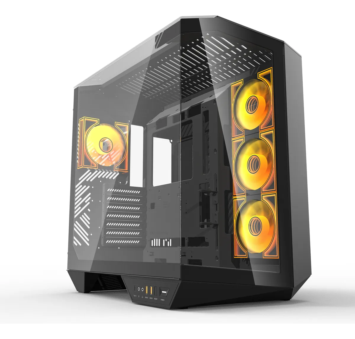 Caja: DY470 Negra Full-Tower ATX – Vidrio panorámico 330° para presumir tu build, airflow óptimo y estética gamer ARGB.
