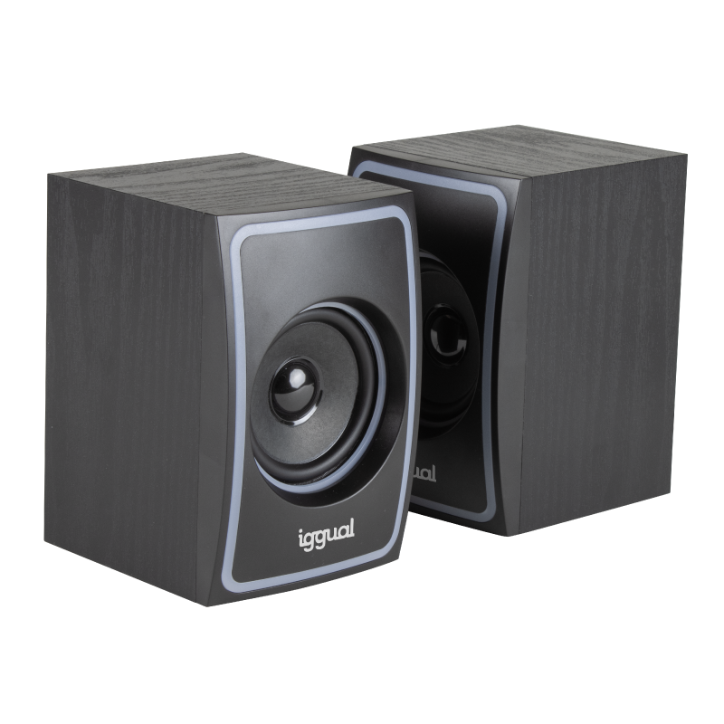 Los altavoces 2.0 iggual de 10W ofrecen una solución sencilla para mejorar el audio en escritorios y despachos. Su sistema estéreo proporciona un sonido claro y equilibrado, ideal para voz y multimedia, sin ocupar apenas espacio.