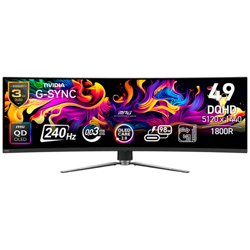 El MSI MPG 491CQPX es un monitor gaming ultrapanorámico de 49 pulgadas con panel QD-OLED de nueva generación. Ofrece resolución DQHD de 5120 x 1440 píxeles en formato 32:9, curvatura 1800R y un tiempo de respuesta ultrarrápido de 0.03 ms (GtG). Con una tasa de refresco de hasta 240 Hz y compatibilidad con G-Sync, está diseñado para jugadores que buscan máxima fluidez y calidad visual.