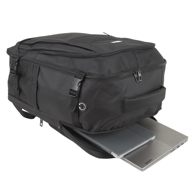 | Características | - Compartimento independiente para portátil y tablet - Admite portátil de hasta 17" - Compartimento frontal de gran capacidad con correas para ropa - Apertura del compartimento frontal de 180º - Entrada lateral para cables de carga o de auriculares - 2 bolsillos laterales de tela - 2 bolsillos exteriores frontales - 1 bolsillo trasero antirrobo - 4 cierres de correa ajustables laterales de seguridad - Respaldo ergo-transpirable - Resistente a lluvia ligera - Multi-organización interna multi-zona - Material exterior: tela Oxford HQ - Material interior: poliéster - Color interior: negro - Color exterior: negro - Dimensiones: 46 alto x 30 ancho x 19 profundo cm - Peso: 970 g |